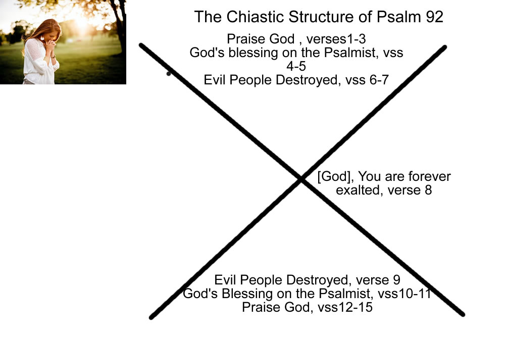 biblehub.com describes Psalms 92 as having a chiastic structure. In summary, this means the format is a letter X; the first and last part of the Psalm are mirrored, and there is a central point. We need to keep this in mind as a key to interpreting this Psalm.
